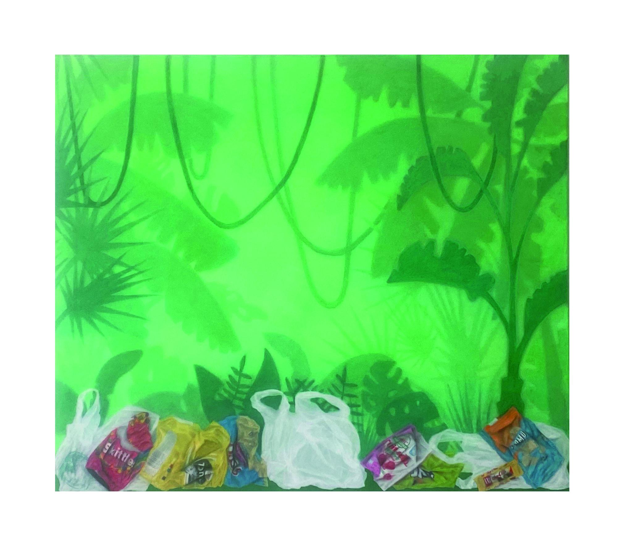 - Technique: Acrylic, plastic waste, polyester fabric, pastel on canvas - 115 x 135 cm