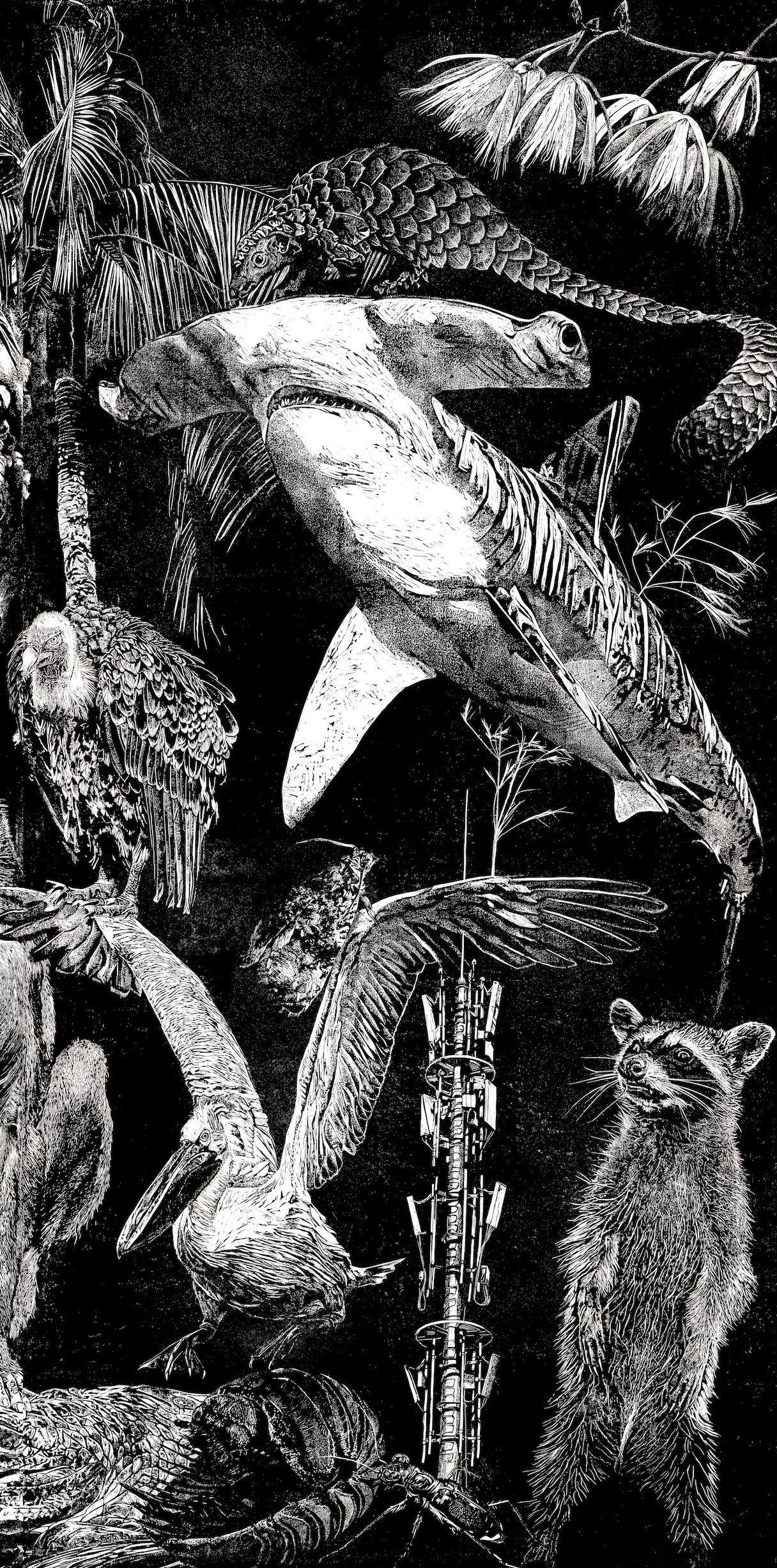 Dufour Camille- Technique: Xylogravure on canvas printed with soap 204 x 104 cm