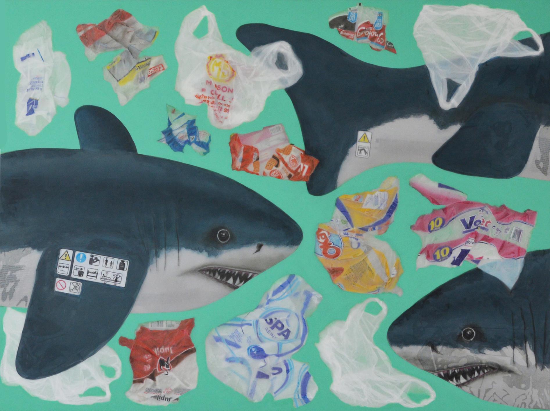 - Technique: inflatable animal, plastic waste, polyester fabric, acrylic on canvas 160x120cm