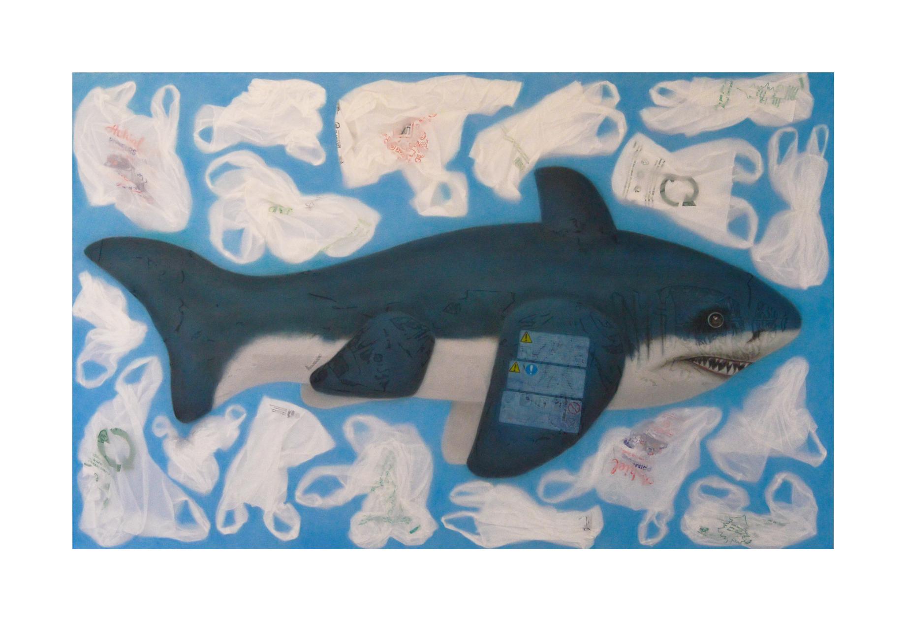 - Technique: inflatable animal, plastic waste, polyester fabric, acrylic on canvas,120x180cm