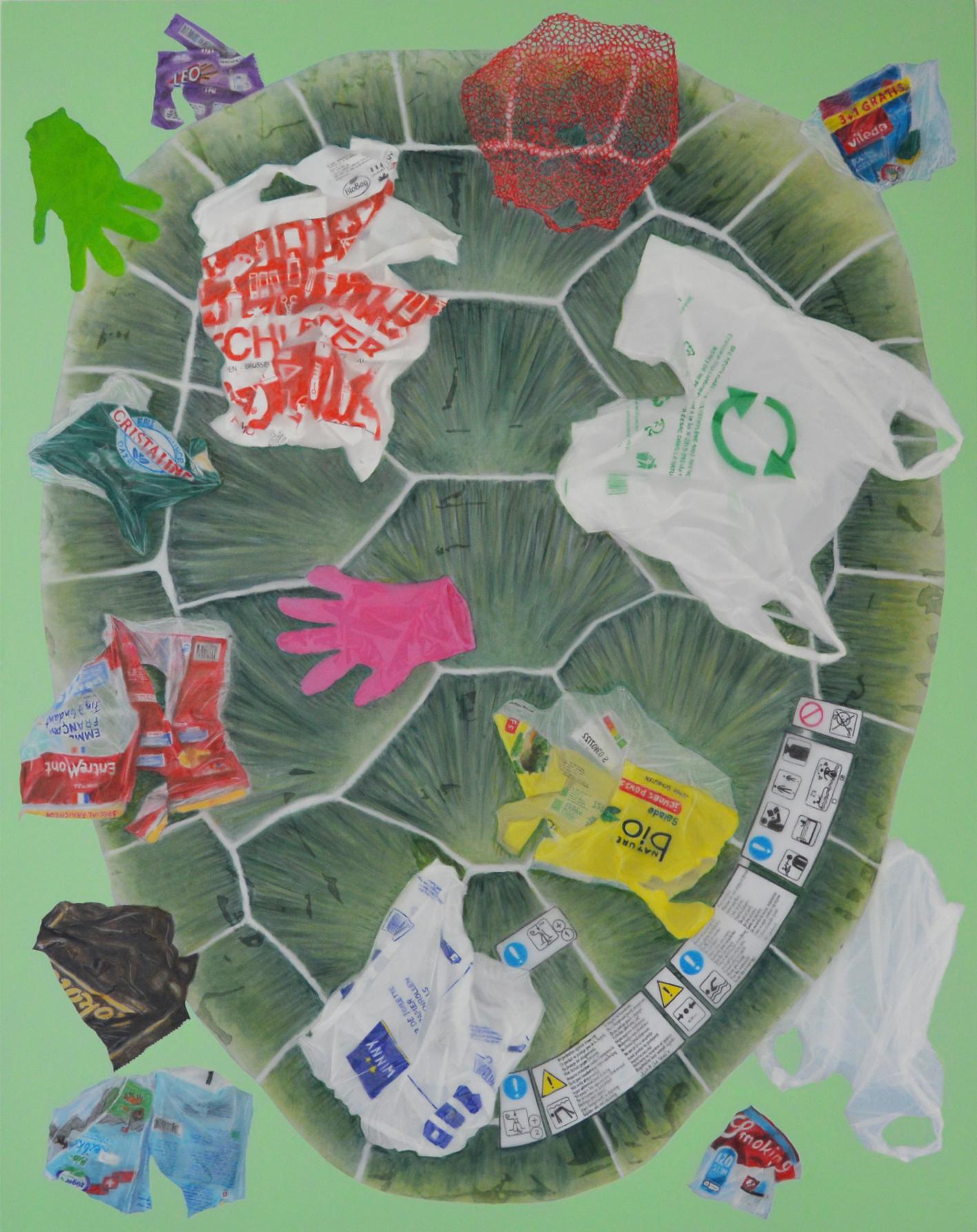 - Technique: inflatable animal, plastic waste, polyester fabric, acrylic on canvas,140x120cm