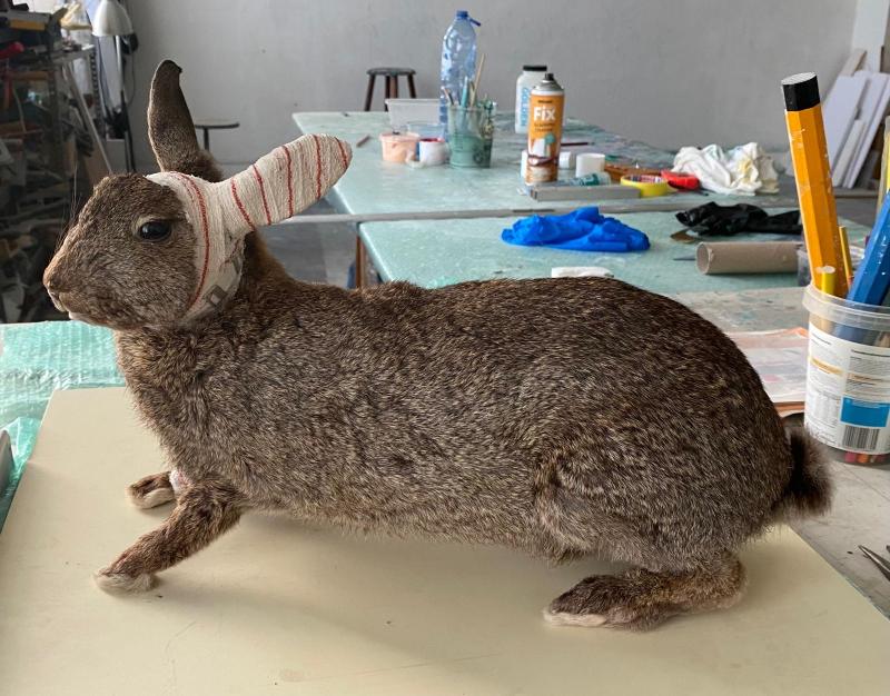 At first glance, Pascal Bernier's works seem to go in all directions, almost incoherently, according to the artist's frenetic desires. All in all, it's a delight, not to say jubilant, like a Sunday visit to a good museum of folk arts and traditions: naturalized animals - elephants, deer, tigers or wild boar - are bandaged after unfortunate hunting accidents; trophies of deer in make-up and wigs adorn the walls; mygales weave their web on Bruges lace; squadrons of butterflies, pennants on their wings, compete with battalions of beetles with decorated elytra for the honors of the entomological collection; a giant teddy bear revisits the eternal philosophical question of nature and culture with a naturalized polar bear.