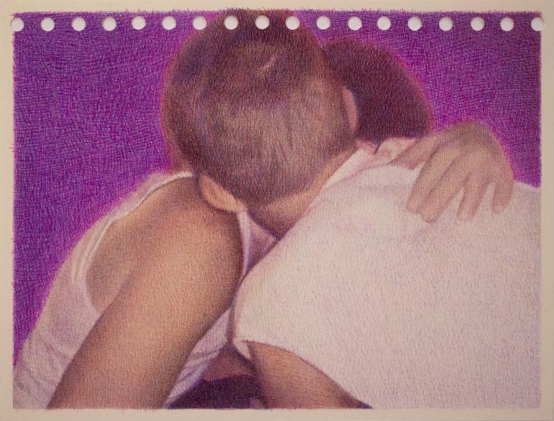 The pictorial practice of Robin Wen explores the world of the Free Party through its lifestyle, that of a youth in search of freedom, an initially documentary approach. Using his personal archives or objects from his daily life, Robin Wen deals with the fragility and violence of this environment with strength and sensitivity. His paintings have become "anthropological objects" and bear witness to a universe that oscillates between the fantastic and the realistic. Robin Wen's artistic practice is founded on technical rigor and mastery of drawing. Using mainly ballpoint pen and occasionally paint, Robin Wen builds up her images with meticulous precision, accumulating layers of extremely precise strokes. This method demands time, patience and great concentration, giving each of Robin Wen's works a remarkable visual density. The choice of the ballpoint pen, a tool often associated with sketching or everyday writing, allows Robin Wen to divert an ordinary medium to produce compositions of great complexity. Robin Wen's work is also distinguished by its hyper-realistic rendering: textures, lights and expressions are rendered with almost photographic precision.